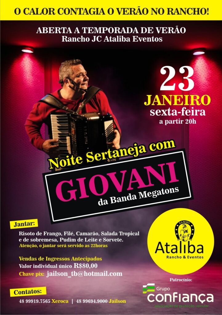 O verão já começou com tudo no Rancho JC Ataliba Eventos, que prepara uma noite especial para marcar a abertura oficial da temporada de verão. No dia 23 de janeiro (sexta-feira), a partir das 20 horas, o público vai poder curtir uma Noite Sertaneja com show de Giovani, da Banda Megatons. O evento promete reunir […]