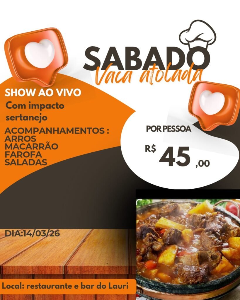O próximo sábado promete ser de boa comida e muita música em Tubarão! No dia 14 de março de 2026, o Restaurante e Bar do Lauri realiza mais uma edição do já tradicional Sábado da Vaca Atolada, reunindo sabor e entretenimento em um só lugar. O prato principal será a deliciosa Vaca Atolada, acompanhada de […]