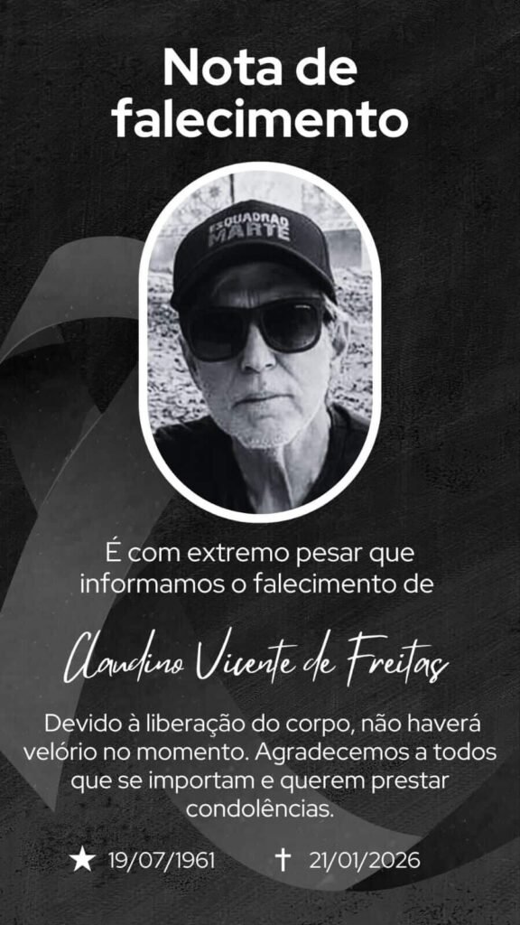 É com profundo pesar que foi confirmado o falecimento de Claudino Vicente de Freitas, ocorrido nesta quarta-feira, dia 21 de janeiro de 2026, aos 64 anos de idade. Nascido em 19 de julho de 1961, Claudino era uma pessoa conhecida e querida por amigos e familiares, deixando uma história marcada por convivência, amizade e momentos […]